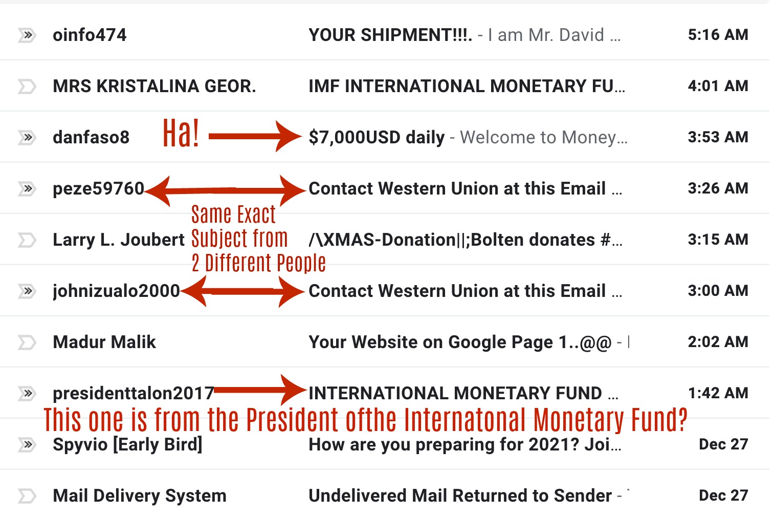 The last one, the President of the International Monetary Fund is writing to me! I am so popular! :) This is a real organization but the email is fake.