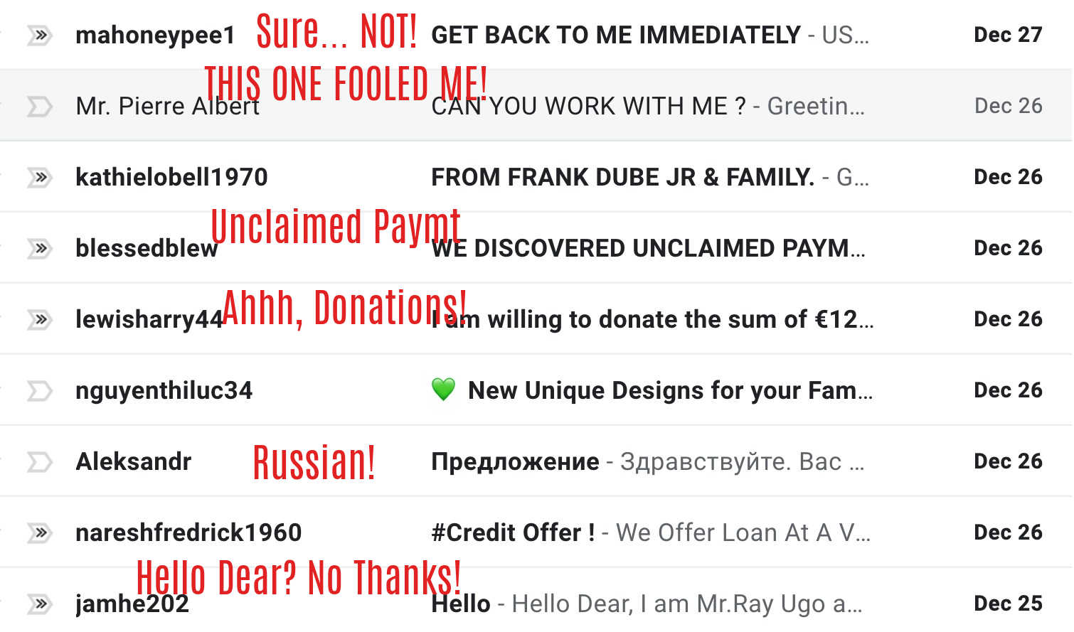 People are so generous online (you realize this is not true, right?)... offering me $7,000 a day, and Xmas donation! WOW! Lucky me! (NOT)