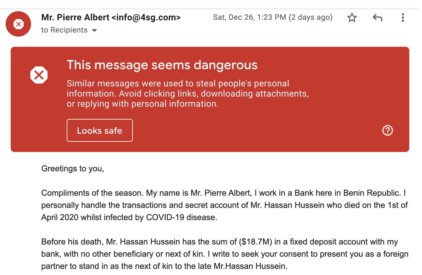Thank you Google -- my Gmail account automatically flags dangerous emails. Many accounts do this, and I hope your email provider helps you in this way!