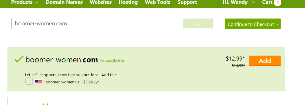 You will notice that I only search for .com addresses. There are many others available, but .com is the best. Most folks don’t even think of other extensions, so if they KNOW you are are Boomer Women, they automatically do .com. They might even think you’ve quit the site if they visit boomer-women.com and you are not there (because you are at boomer-women.net).
