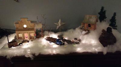 It's a walk down old days lane. The country store with a Ford Woodie and an old log flat bed truck with a mill on a hill with a waterwheel, among other things we remember, or not. The rancher and logger are pictures off the internet, sized down and glued together a couple to make them strong, they are paper. The cars are metal detailed collector pieces. There is a pond with river stone you can't see in the snow but it all came together for the fun of winter memories for us older folks.